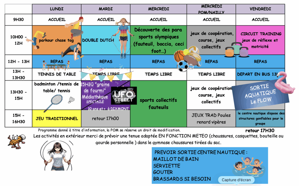 Pour qui ? tous les enfants à partir de 6 ans Une semaine d’activités sportives avec une sortie en bus dans une structure de loisir.